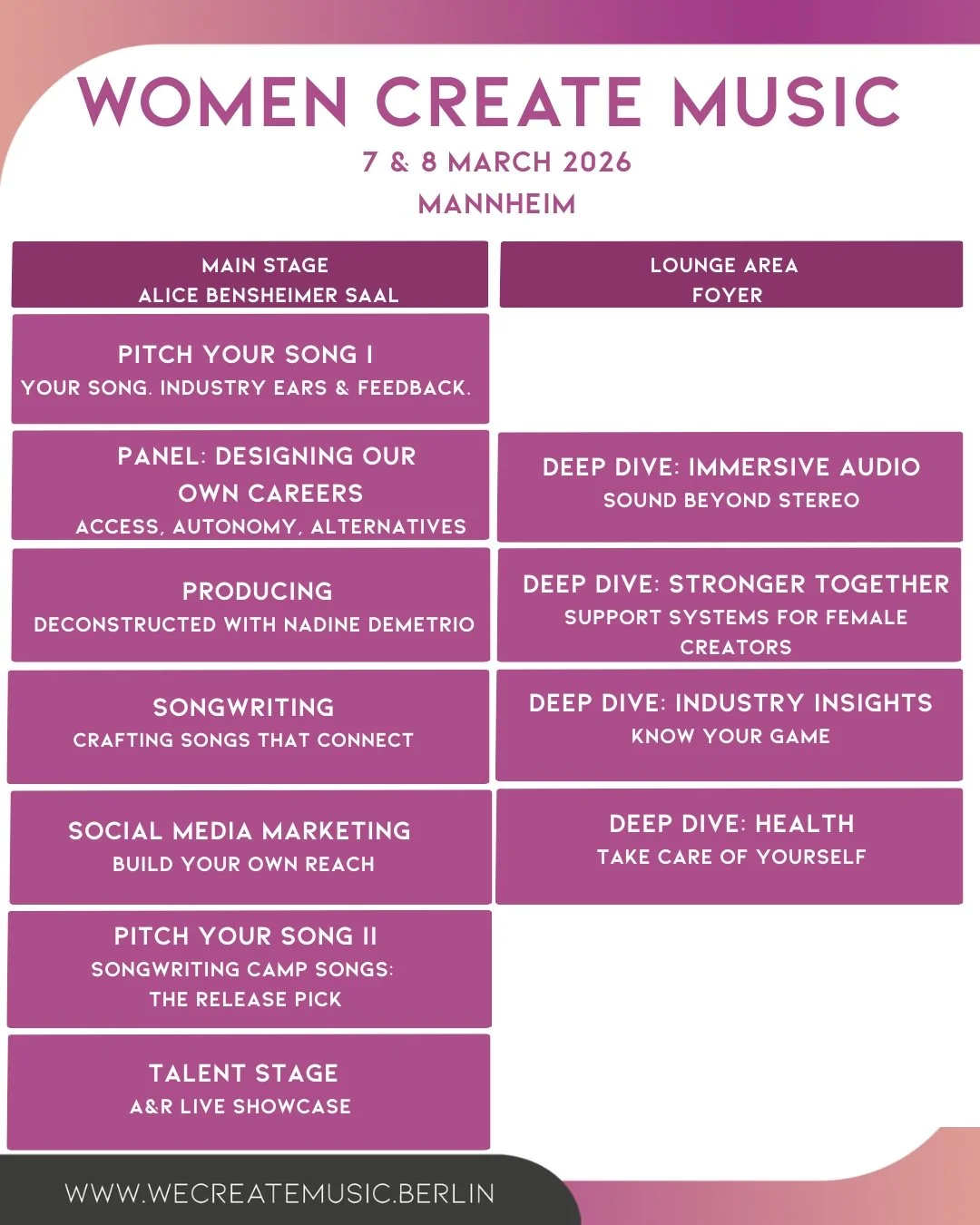 With Women Create Music, we are launching a long-term initiative dedicated to elevating and empowering female music creators across the entire music ecosystem. Our partners in this mission are I’M SOUND, BASF Kultur, Rosengarten/M:Con and Popakademie Mannheim — together we are building a movement that creates visibility, real opportunities, and lasting networks for female artists, songwriters, and producers.